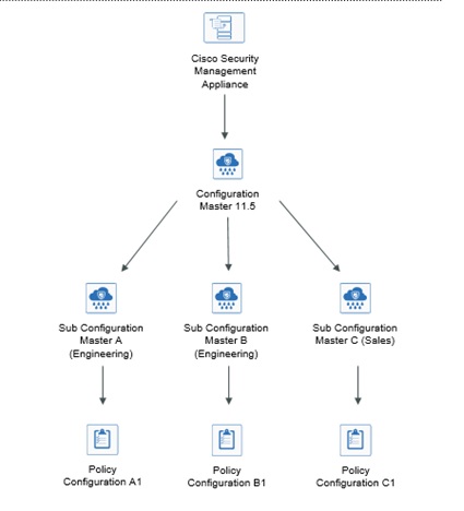 Assume that your engineering and sales teams are using AsyncOS 11.7 for Web Security appliances. Your organizational policy requires you define different policies for these teams. In this scenario, you can create two sub configuration masters under the Configuration Master 11.7 and define different policy configurations for each sub configuration master, as shown in the following figure: