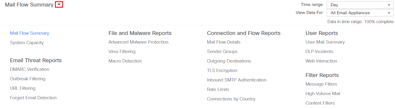 Note | The Mail Flow Summary report page is the landing page (the page displayed after login). |